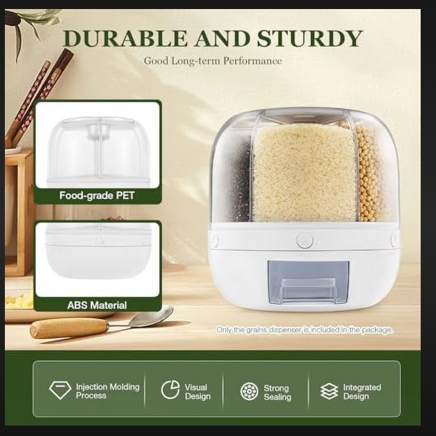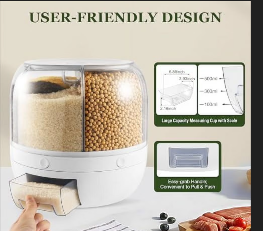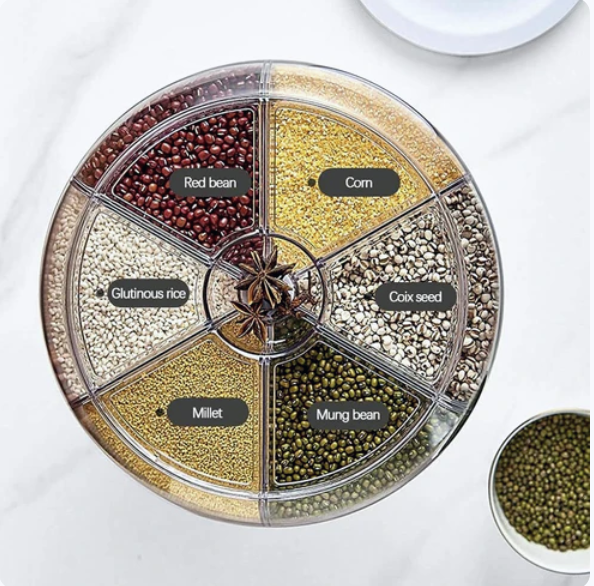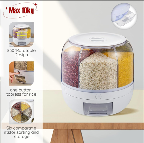 - Smart Features360° Rotation - Easy access to all compartmentsOne-Touch Dispenser - Perfect portions every time6 Clear Containers - See your supplies at a glanceSecure Lid - Keeps contents fresh and dry